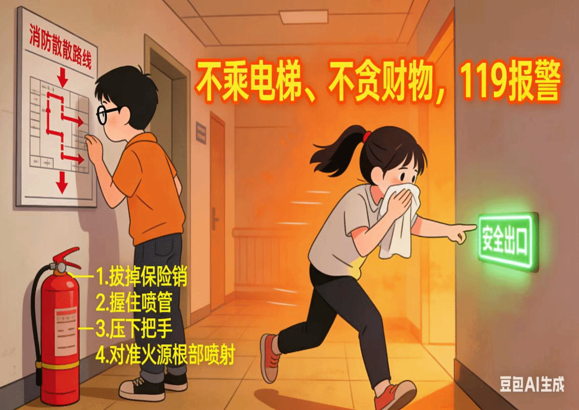 发现火情及时报警,并学会低姿捂鼻速逃生