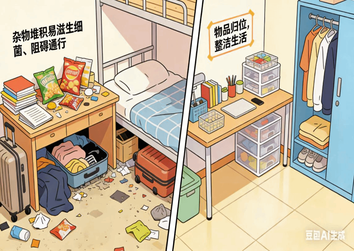 宿舍物品摆放整齐,杂物堆积后患无穷