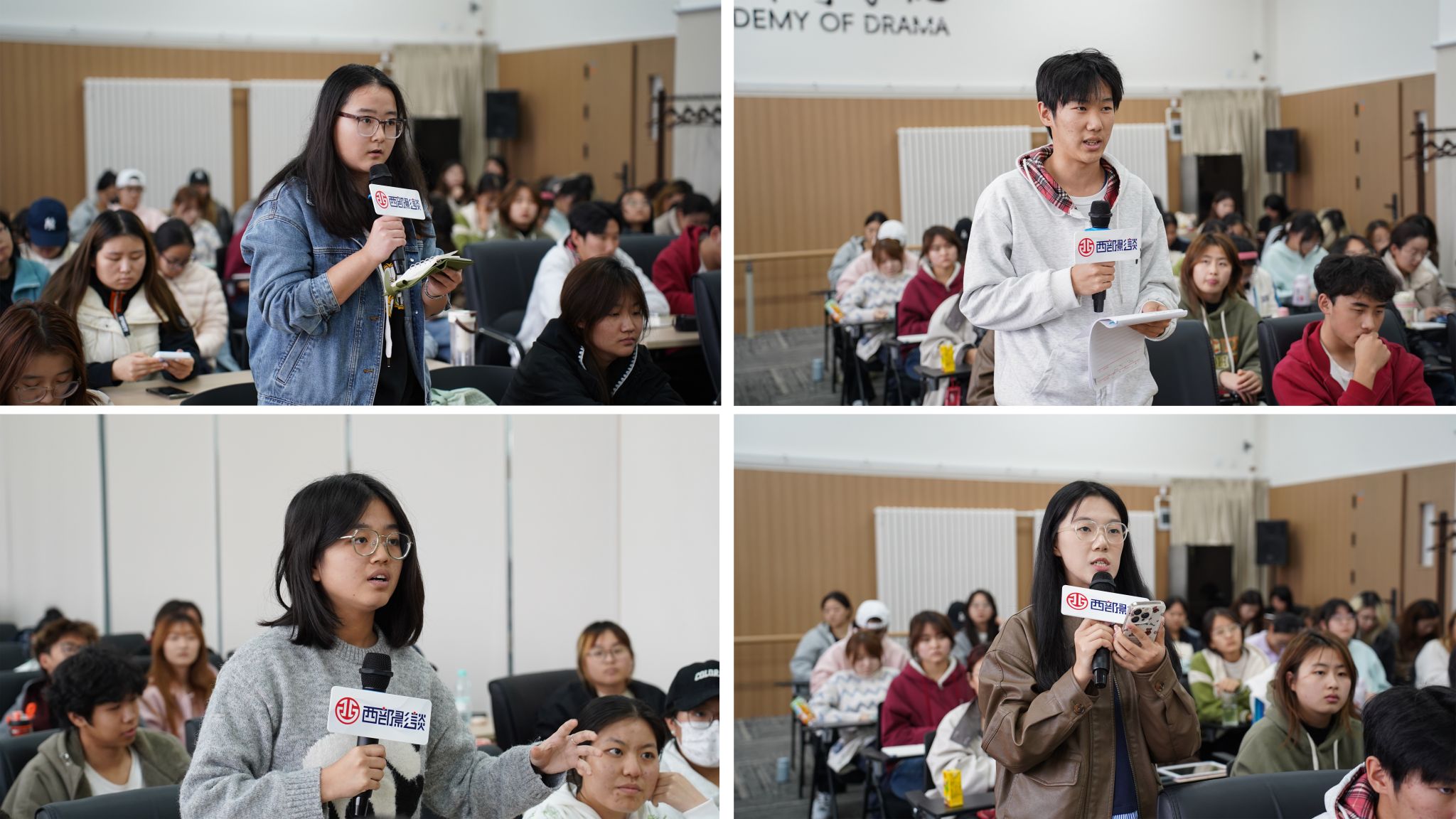 在随后的提问环节,现场气氛达到了高潮。我校学子展现出扎实的专业素养和敏锐的艺术洞察力,提出的问题精准而深刻。同学们围绕导演构思、人物塑造、细节刻画、镜头设计等多个维度,与田波导演进行了热烈探讨。田导对这些高质量的问题大加赞赏,并一一给予了耐心细致的解答,现场金句频出,掌声不断。
