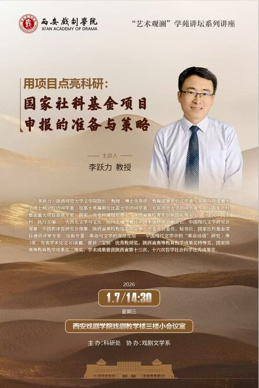 为进一步提升我校教师国家级科研项目申报能力,强化科研组织与学术共同体建设,1月7日下午,由科研处主办的“艺术观澜”学苑讲坛第二期专题讲座在戏剧教学楼三楼会议室举行。本期讲座特邀陕西师范大学文学院院长、博士生导师、教育部青年长江学者李跃力教授作题为《用项目点亮科研:国家社科基金项目申报的准备与策略》的专题讲座。学校拟申报国家级科研项目的相关教师积极参加讲座,现场学习氛围浓厚。
